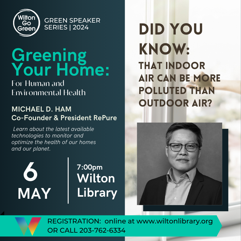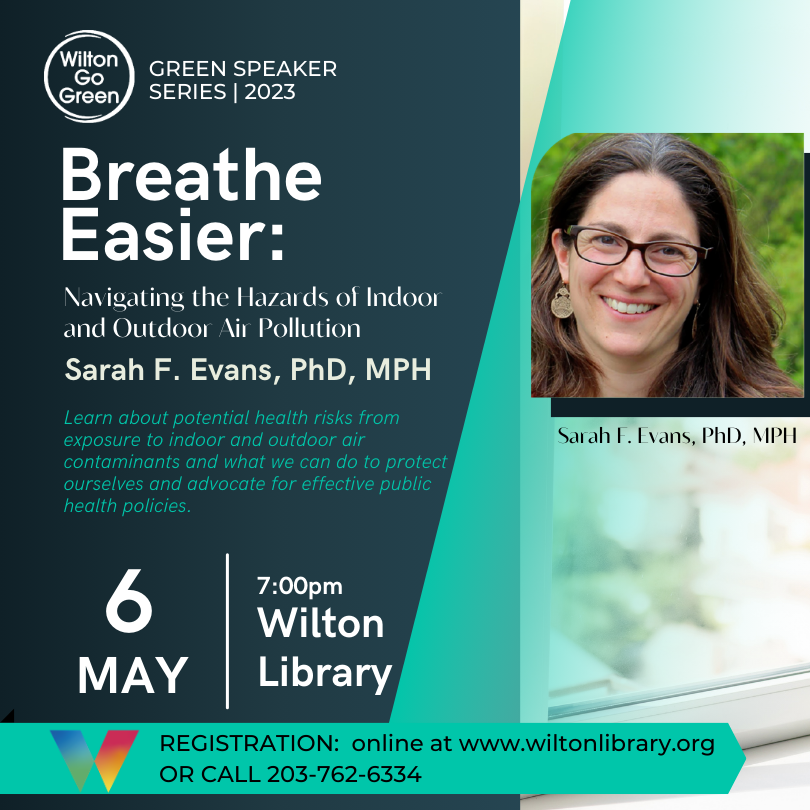 Dr. Sarah Evans speaks about potential health risks from exposure to indoor and outdoor air contaminants and what we can do to protect ourselves and advocate for effective public health policies. Patrice Gillespie, a founding member of Wilton Go Green, Wilton native, and long-time advocate for clean air and environmental sustainability, will tie the lessons from Dr. Evans’ talk to Wilton’s no-idling policies.