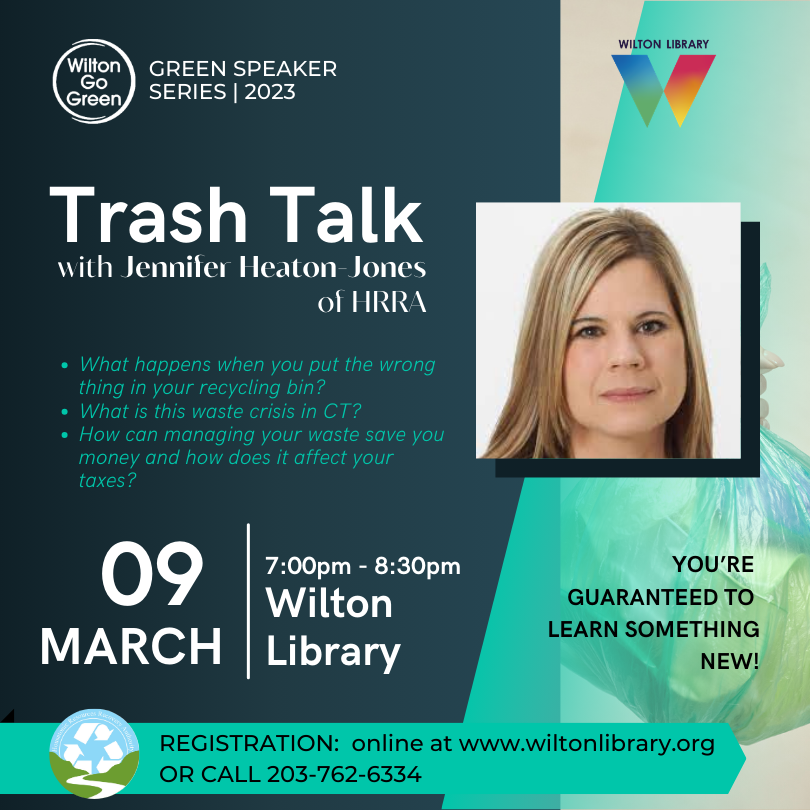 Jennifer Heaton-Jones the Executive Director of the regional, governmental, solid waste and recycling authority, Housatonic Resources Recovery Authority (HRRA). She will give a one hour presentation followed by a half hour Q&A. You’re guaranteed to learn something new!