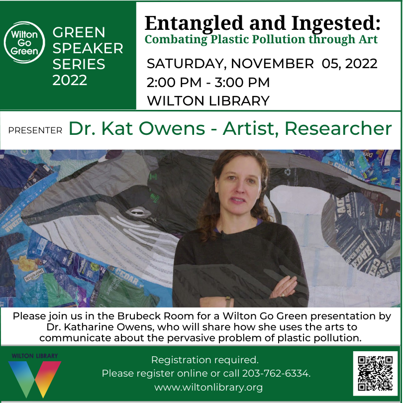Dr. Katharine Owens will share how she uses the arts to communicate about the pervasive problem of plastic pollution. A researcher and artist, Dr. Owens has spent the last year and a half creating a series of forty-six life-sized portraits of animals harmed by marine debris. She creates most of the pieces herself by hand sewing film plastic onto canvas, but the largest pieces (including three life-sized whales) are being co-created with the public.