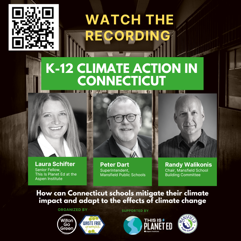Join Wilton Go Green and Waste Free Greenwich for a webinar on how the education sector can lead on climate solutions in Connecticut. Explore the Aspen Institute’s K12 Climate Action plan and This Is Planet Ed initiative to learn how education systems can reduce their carbon footprints through energy, transportation, and food and discover how Mansfield Public Schools are reducing their climate impact and saving money through their new net zero school building.